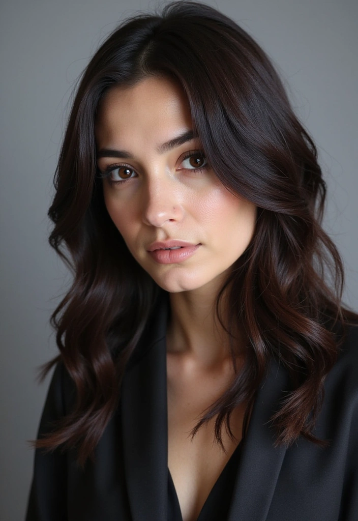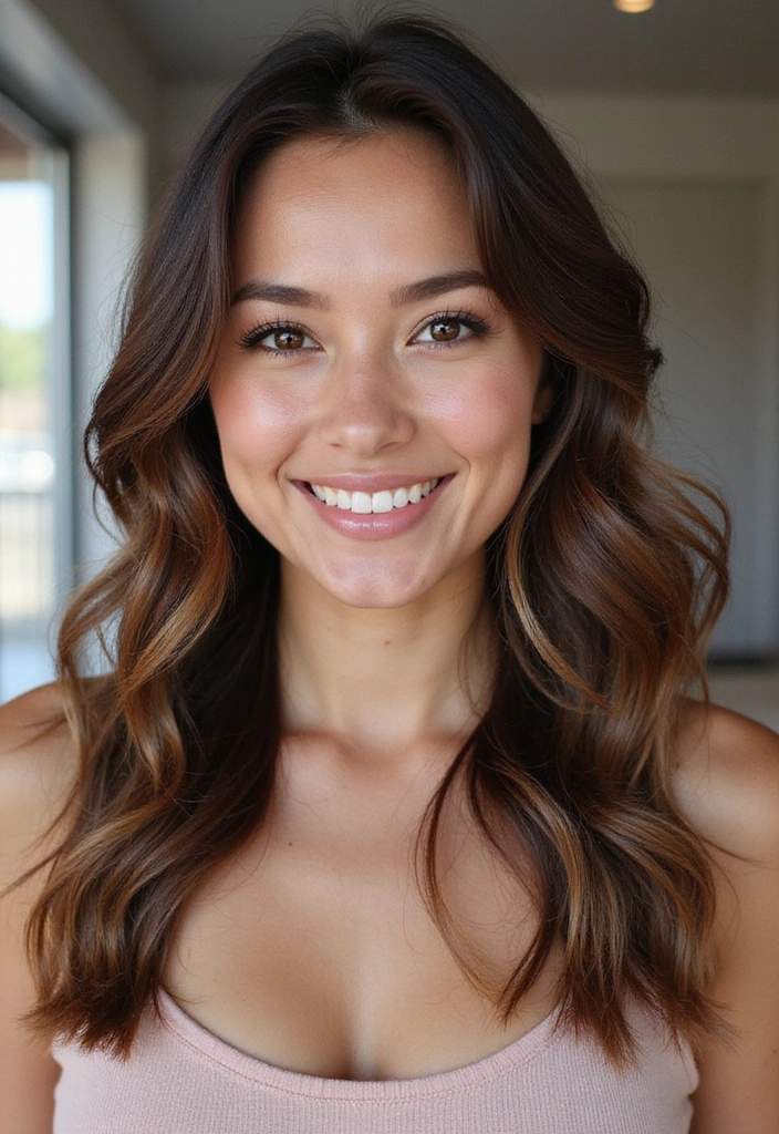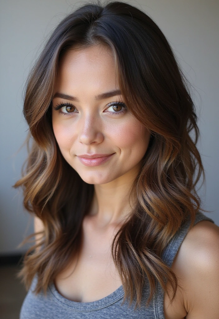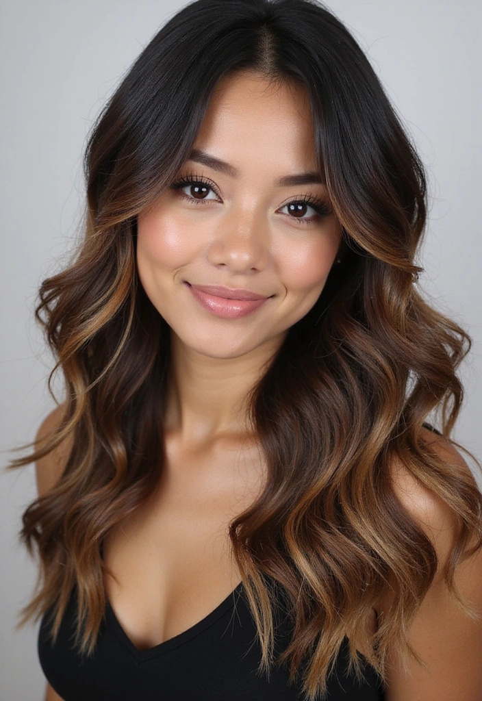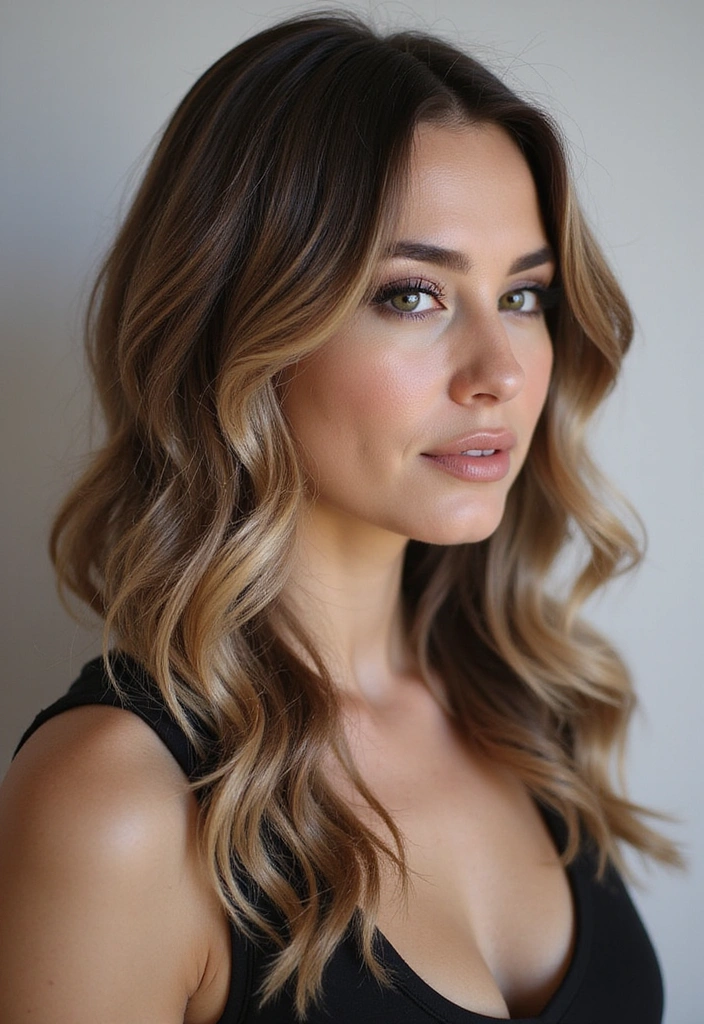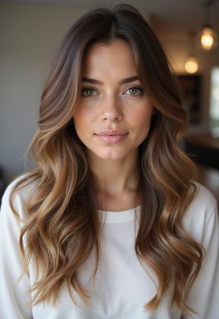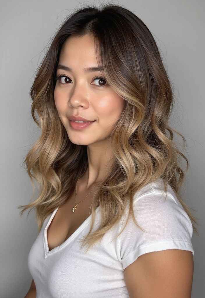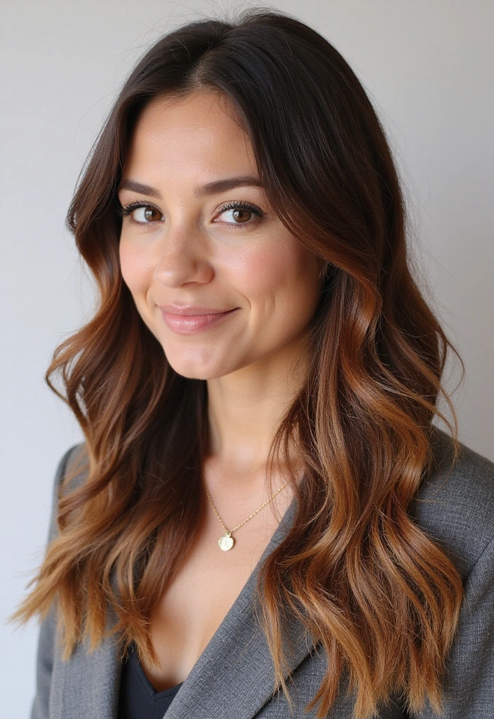 The warm tones enhance natural beauty and are particularly flattering for all skin types. This style feels sophisticated yet casual, making it versatile for any occasion.