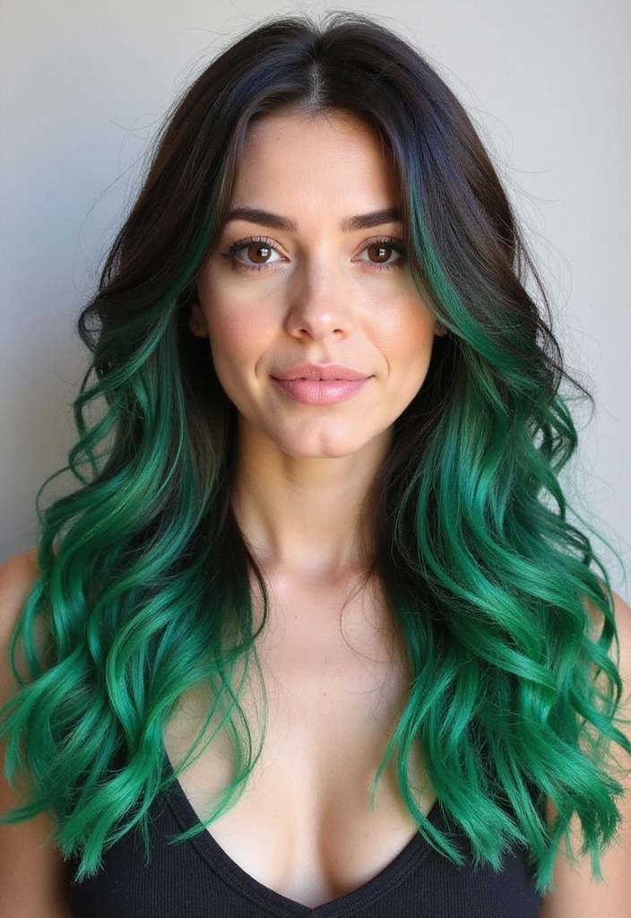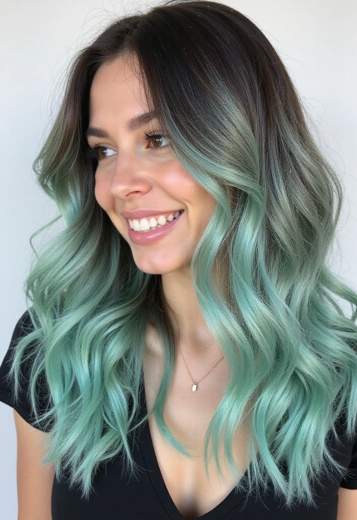 Soft mint balayage is a fresh and modern twist on dark brown hair. This playful look features soft mint tones that blend beautifully with dark brown, creating a whimsical and enchanting effect. Ideal for anyone wanting to embrace their unique style!