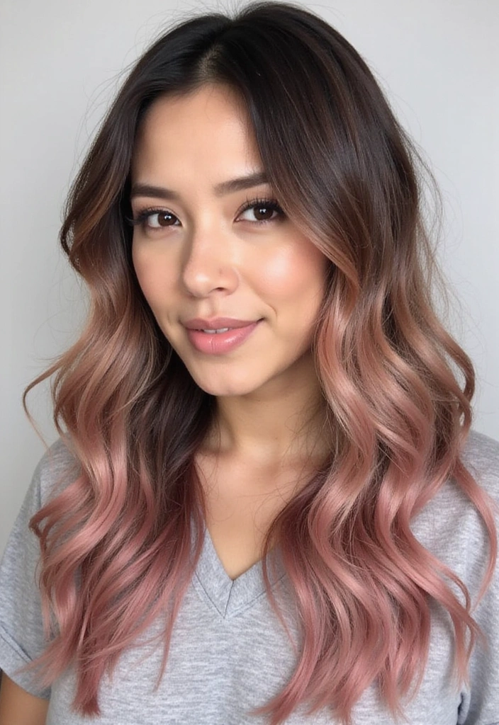 Soft rose gold highlights are a trendy option for anyone looking to add a romantic touch to their dark brown balayage. This delicate blend of pink and gold hues provides a soft, feminine look that shines in natural light. It’s perfect for those wanting a playful yet chic hairstyle!