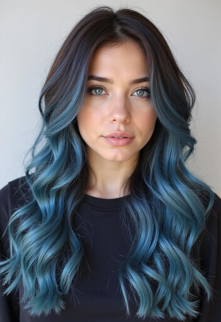 Frosty blue highlights on dark brown balayage create a fun, trendy look perfect for anyone wanting to embrace a unique style. The combination of deep brown with icy blue tones creates a striking and modern appearance. It’s perfect for festivals, parties, or just when you want to stand out!