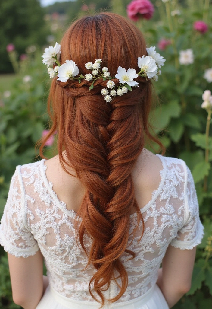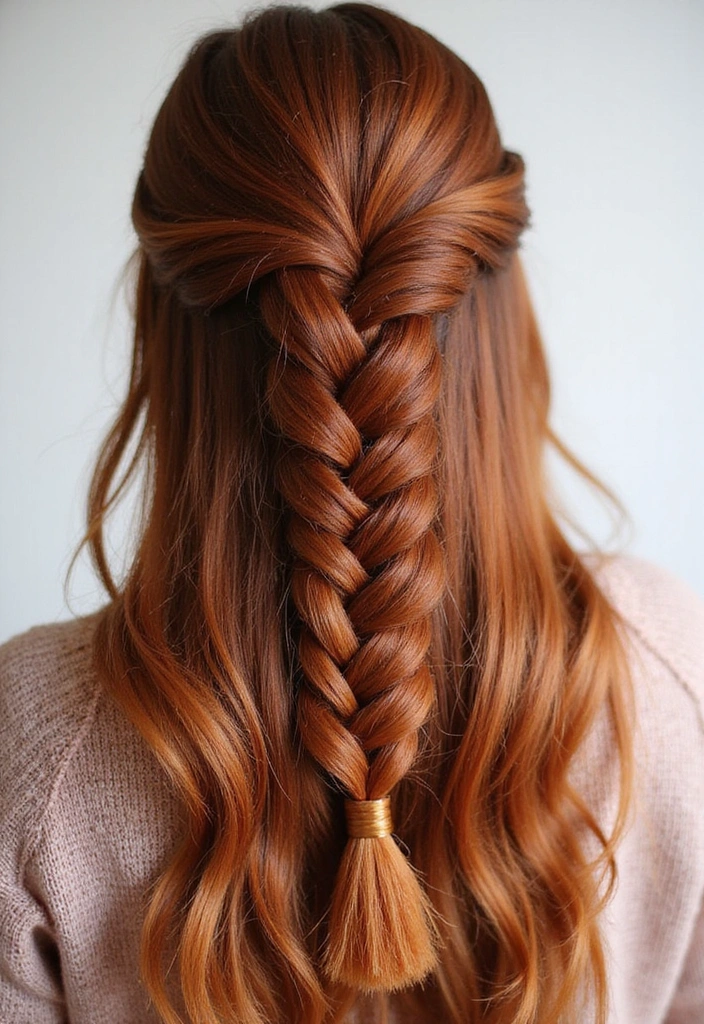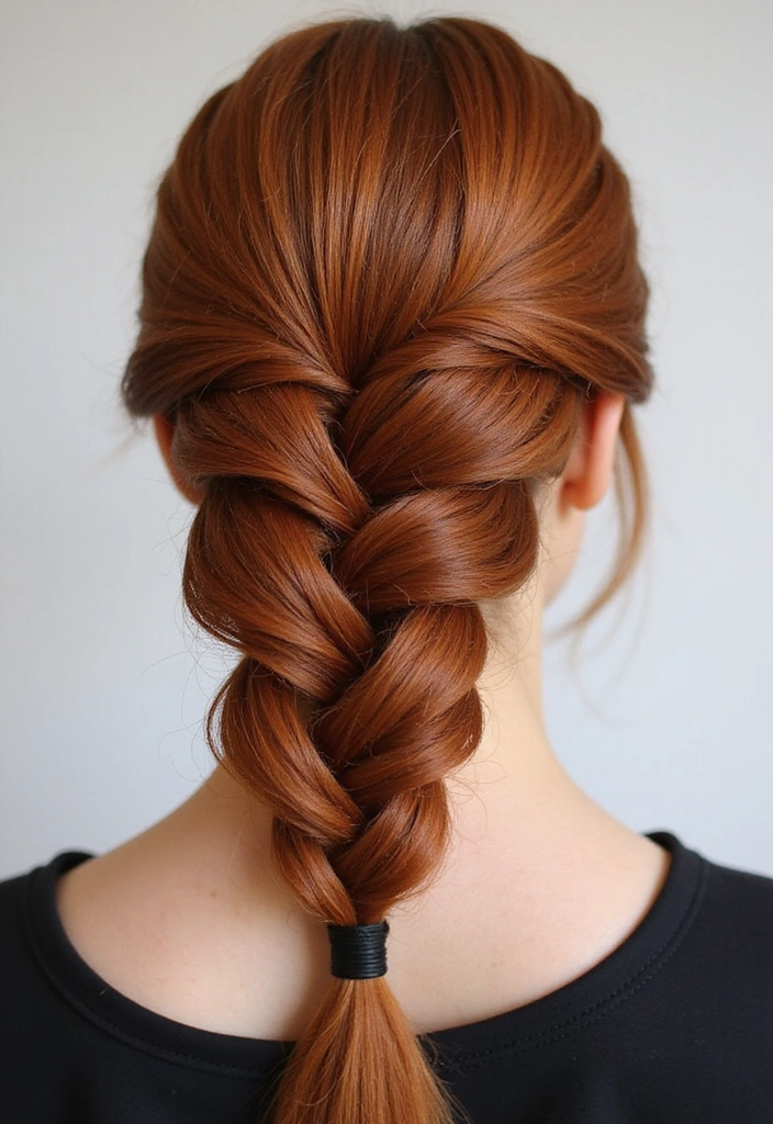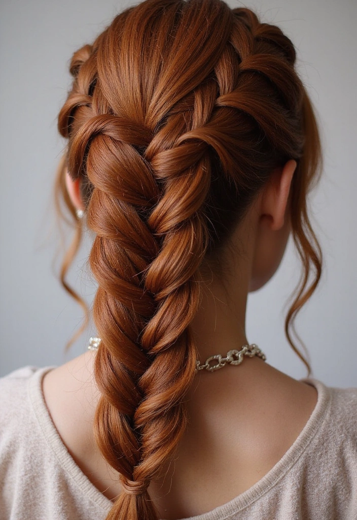 This style involves weaving the hair into a beautiful fishtail pattern, showcasing the rich auburn colors.