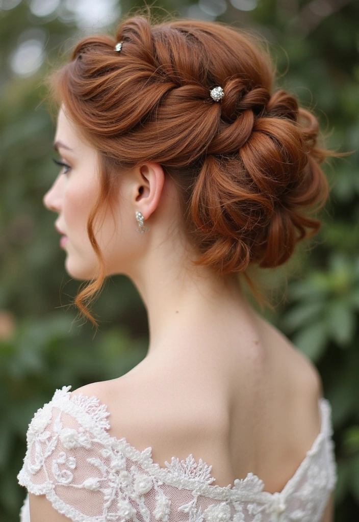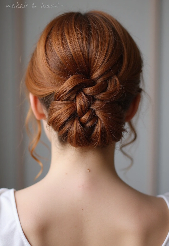 The braided bun in auburn is a beautiful, intricate style perfect for formal events or romantic outings.