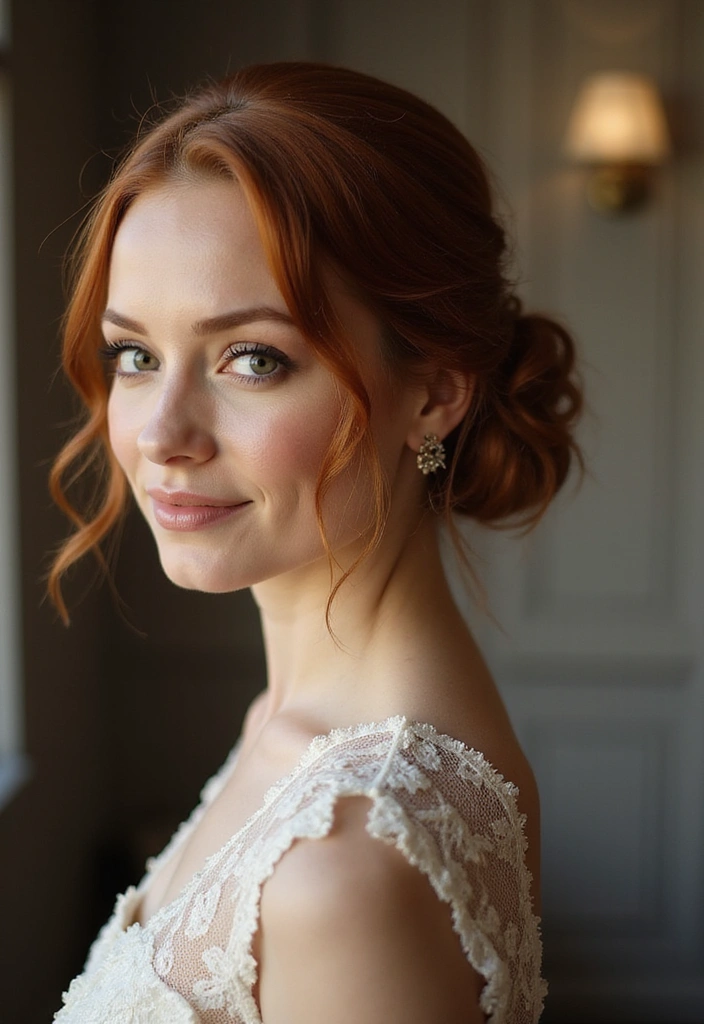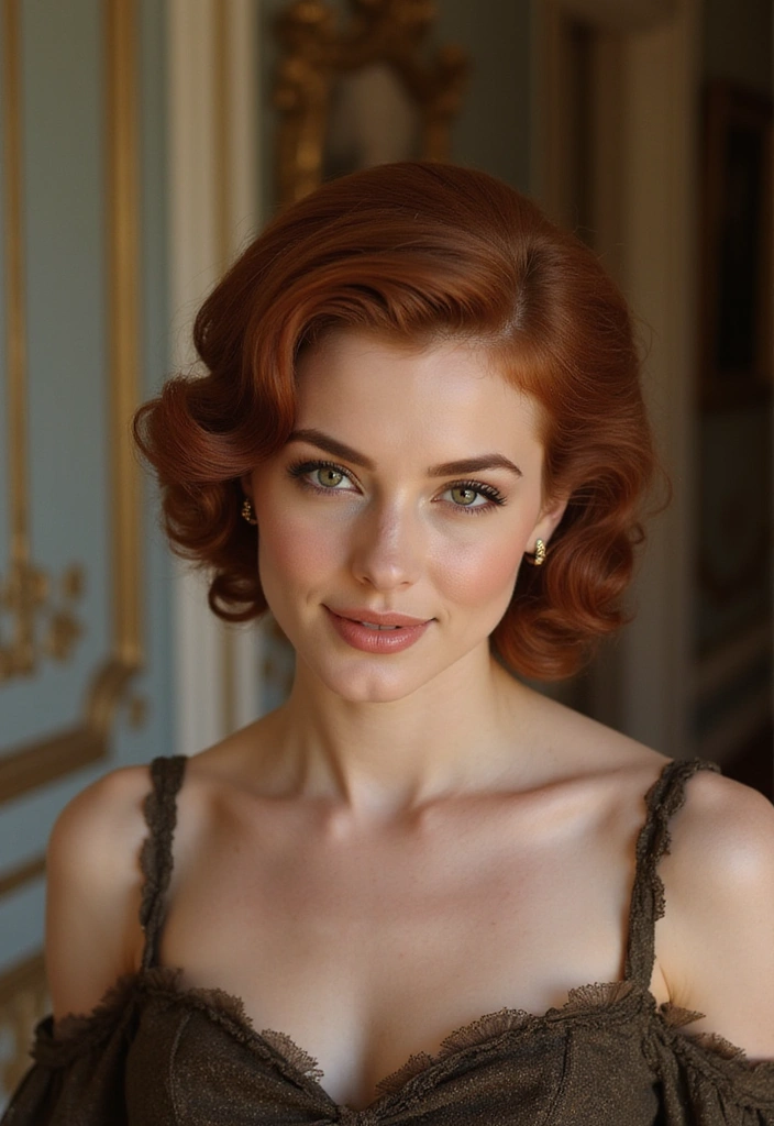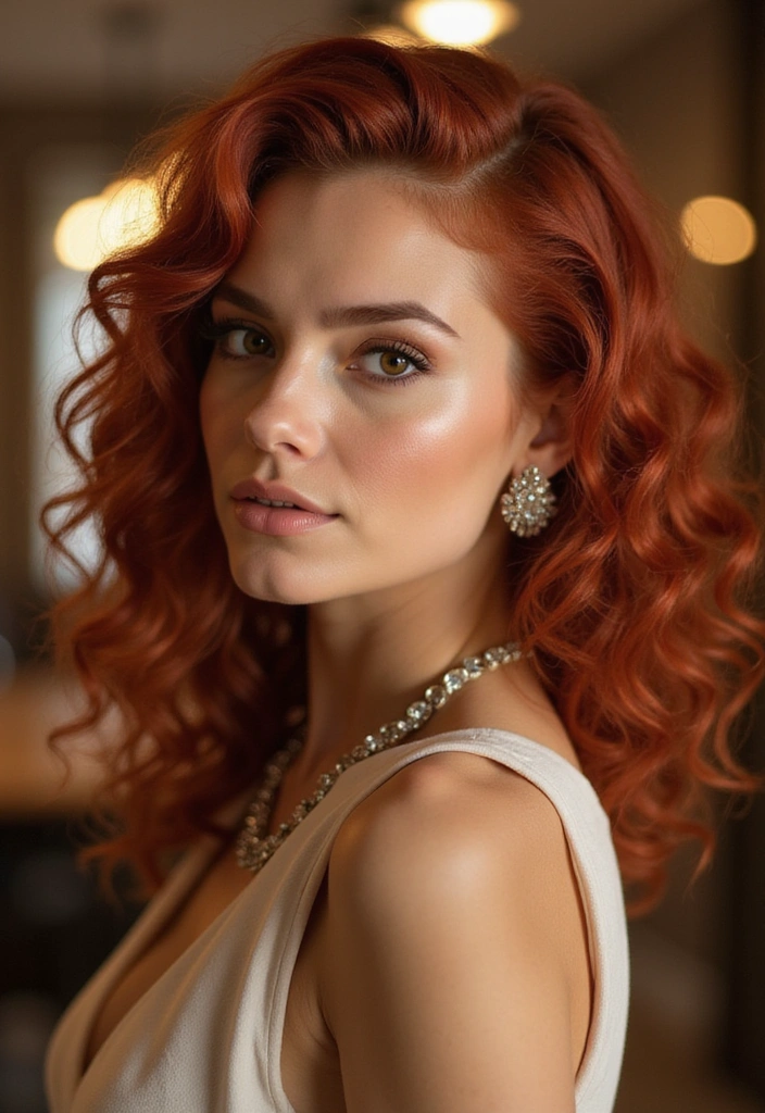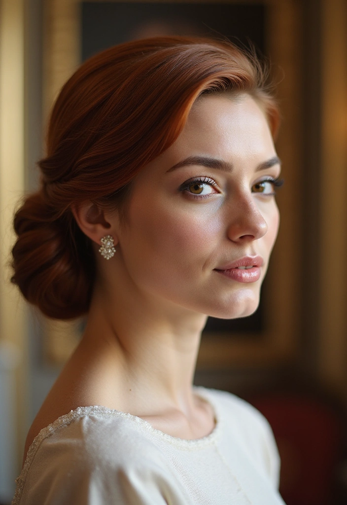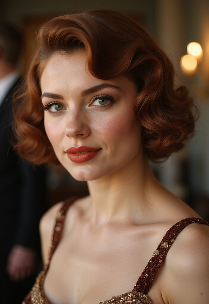 Perfect for formal events or vintage-themed parties, this hairstyle beautifully showcases the rich auburn color.