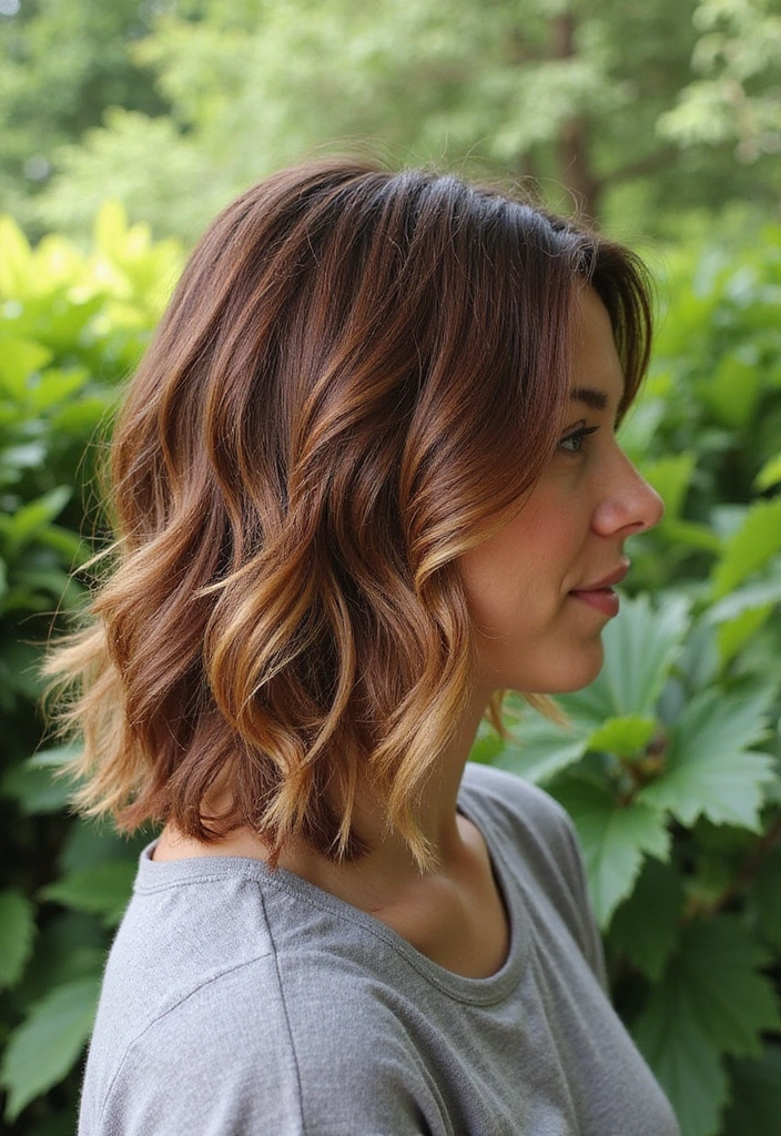 A textured lob (long bob) in auburn offers a modern twist on a classic cut, providing a fun yet sophisticated look.