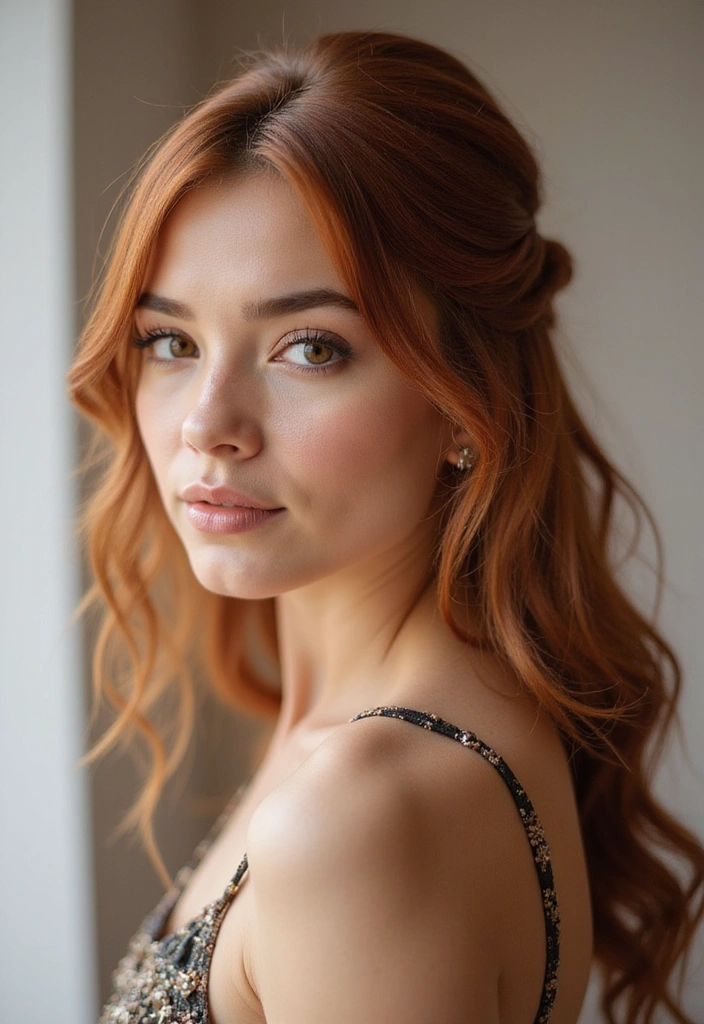 The half-up, half-down hairstyle is a versatile choice that works wonderfully with auburn hair.