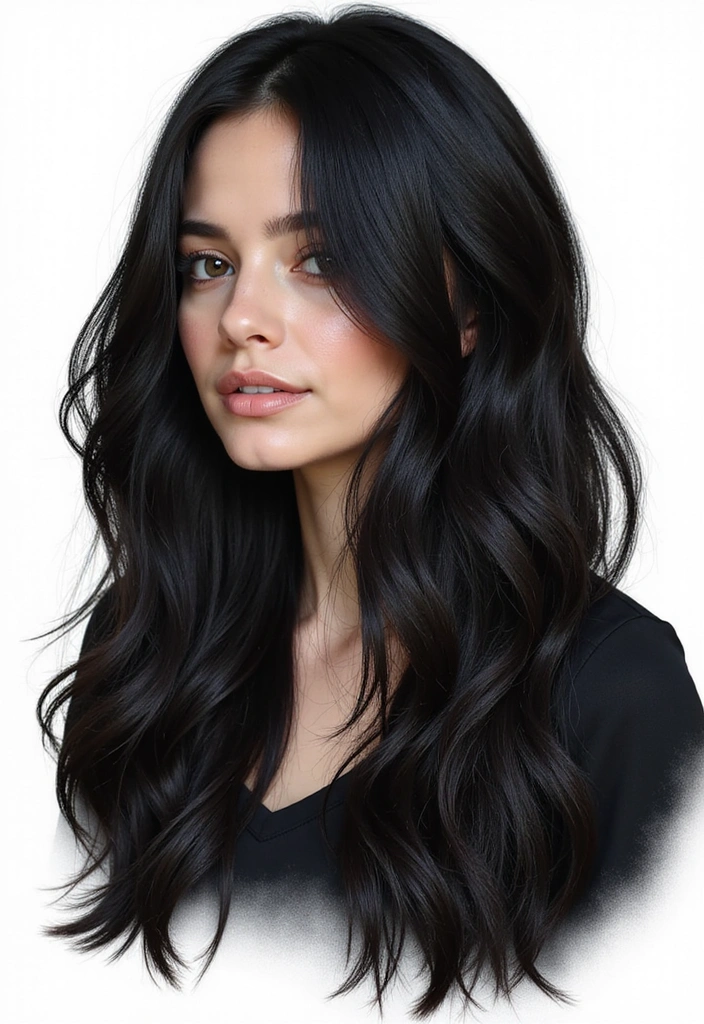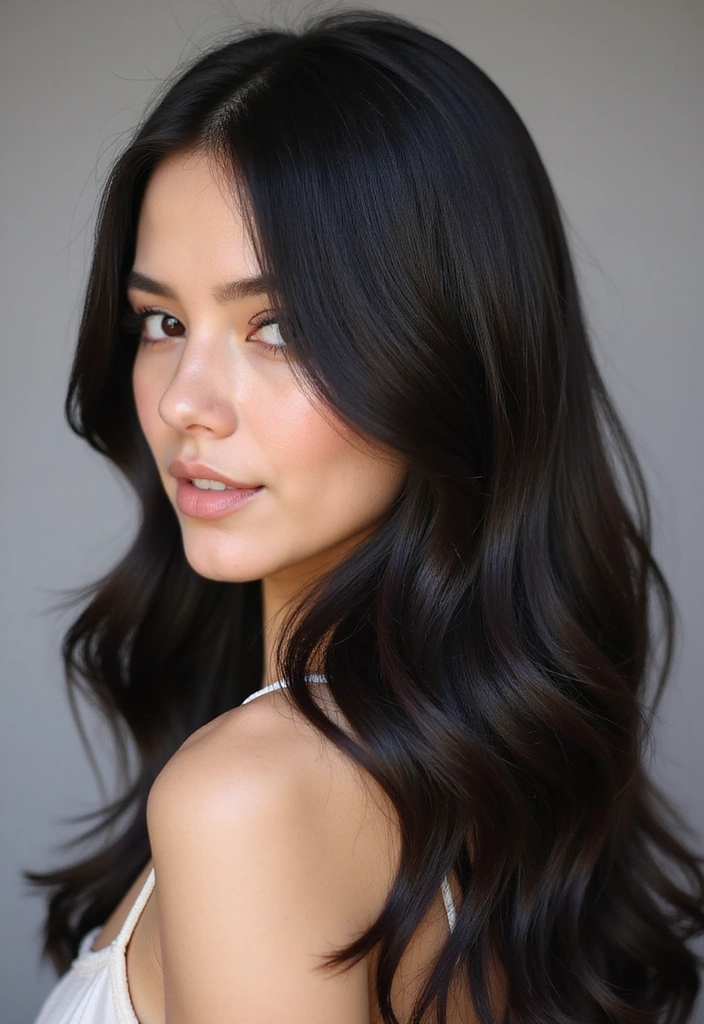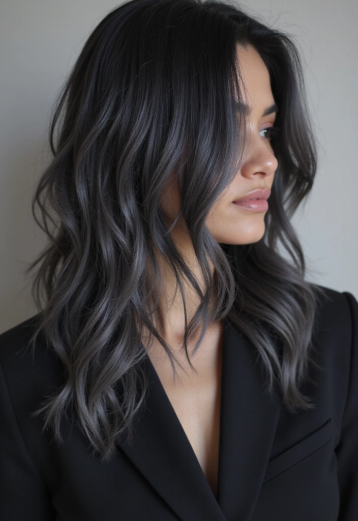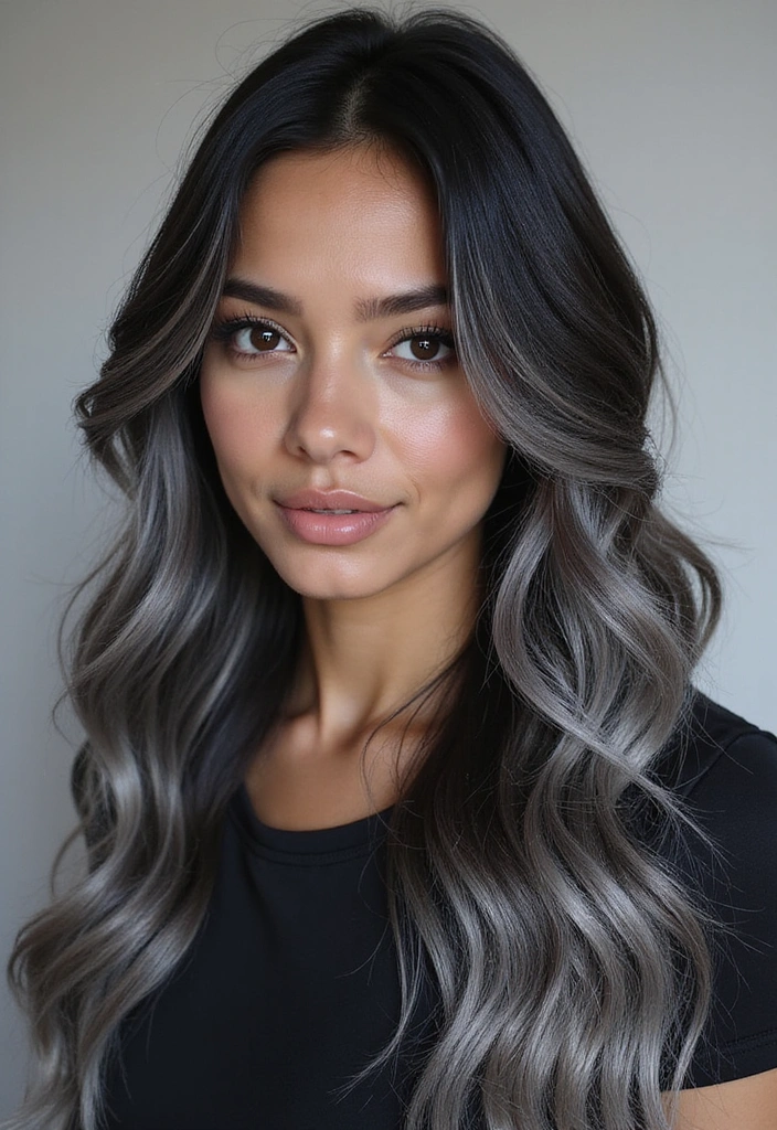 The gray can be placed strategically throughout your hair for a touch of sophistication. The cooler tone contrasts beautifully against the deep black, creating a striking visual effect.