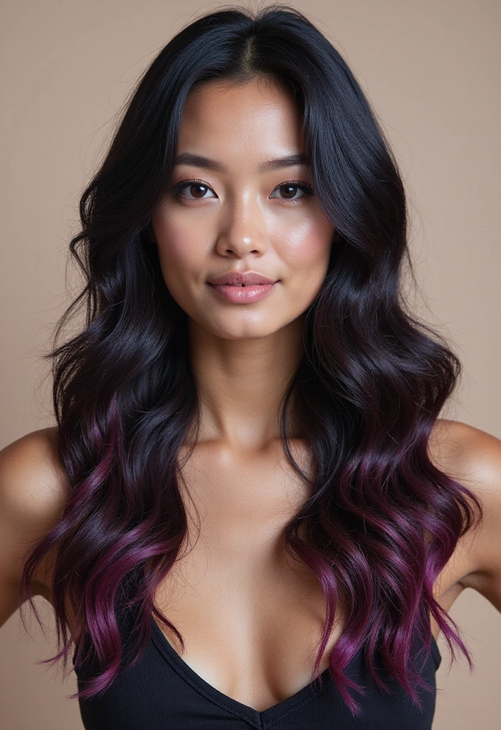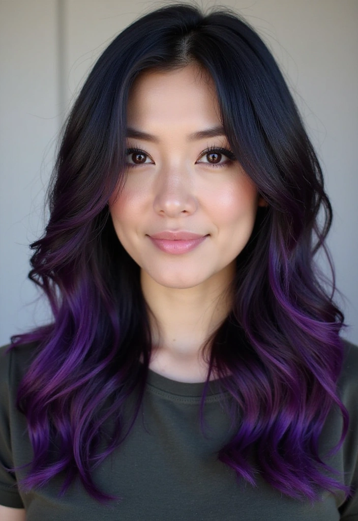 For a fun and unconventional look, deep purple highlights are an amazing option! This rich color adds a playful twist to black hair while maintaining a sophisticated aura. It’s perfect if you want color but still wish to keep it classy!