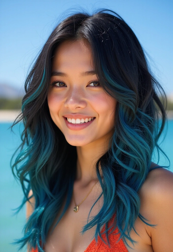 Style your hair in beachy waves to enhance the ocean theme and showcase the beautiful blue highlights!