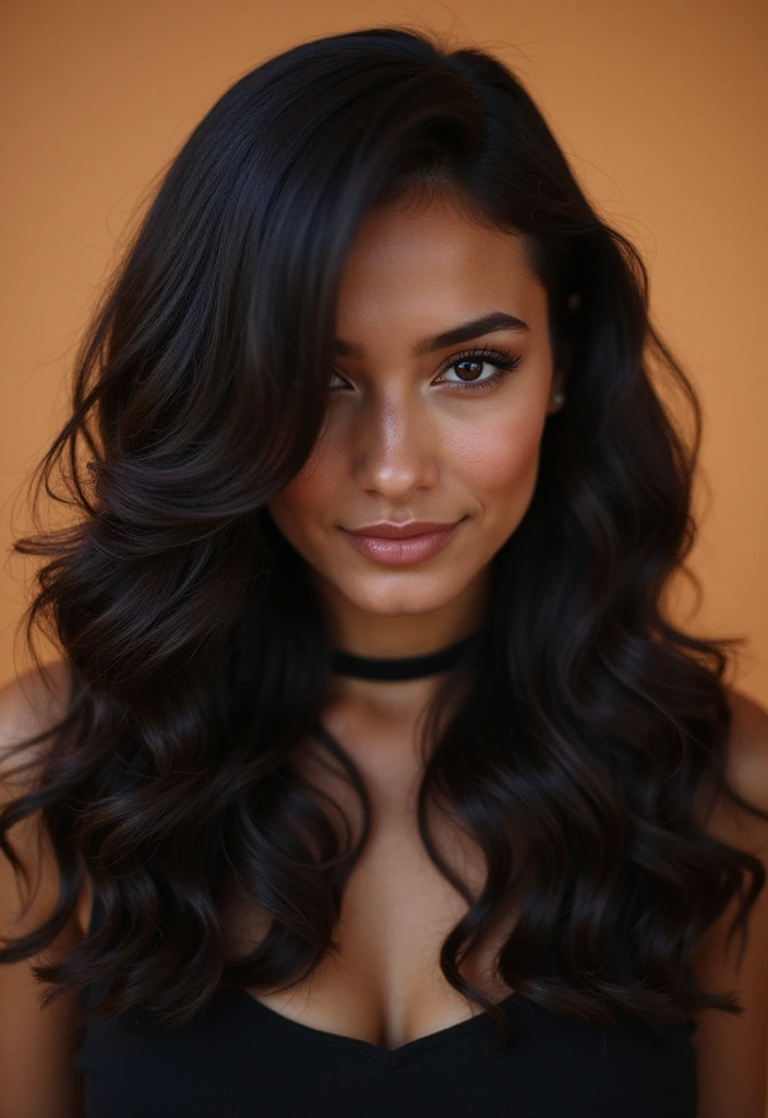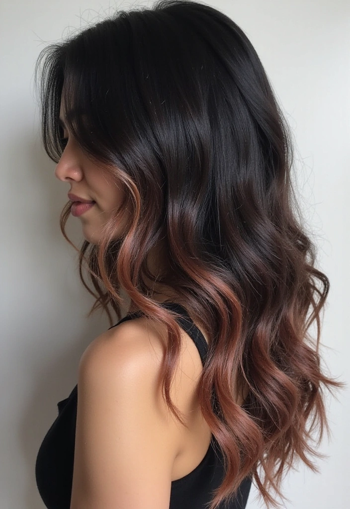 Warm copper highlights are a magnificent way to add a fiery touch to black hair. This unique shade blends beautifully with black, creating a rich, luxurious look. Copper adds warmth and a bit of radiance, making it perfect for those who want a change without going too far from their natural color.
