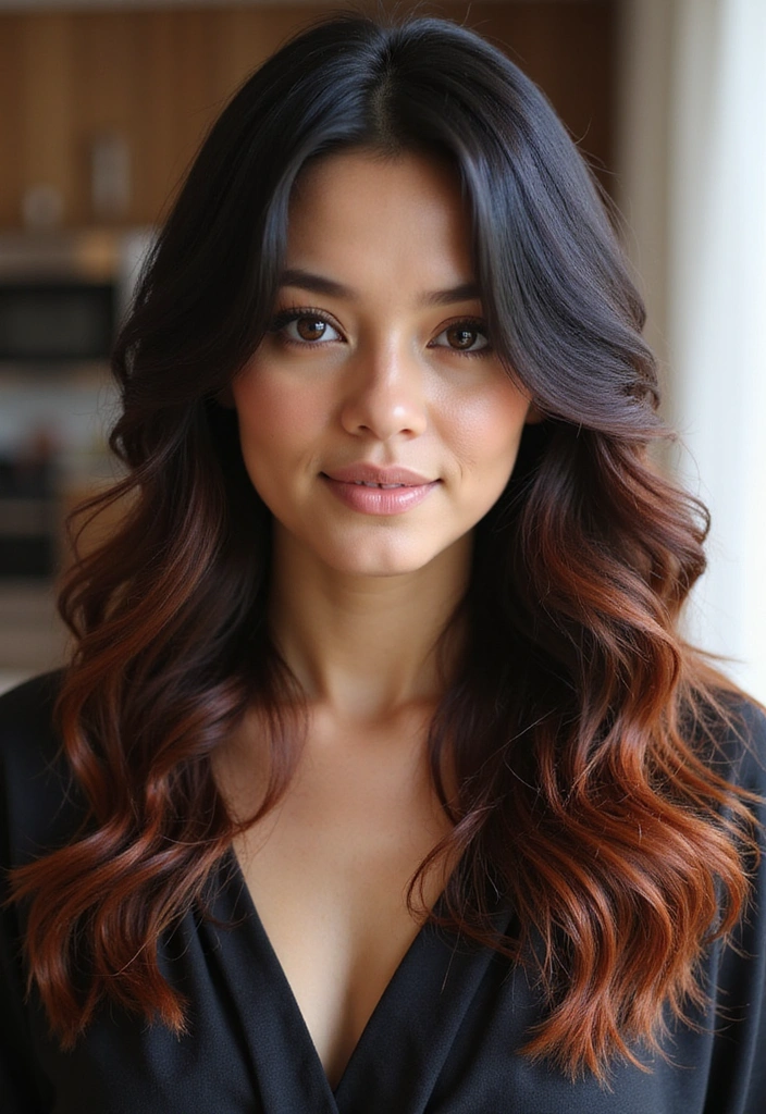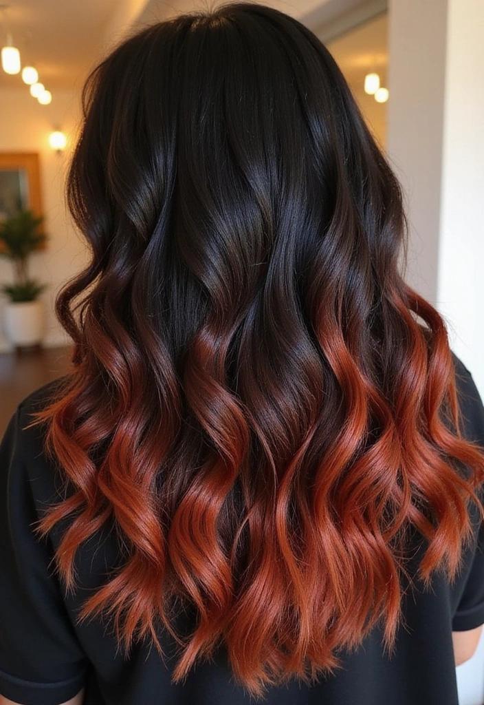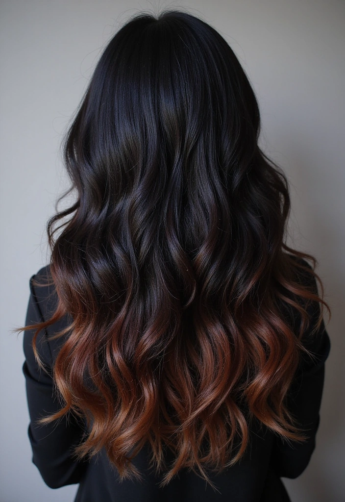 Rich copper ombre adds a beautiful depth to black hair, creating a warm and inviting appearance. This technique transitions from dark black to rich copper at the tips, providing a stunning visual depth that beautifully highlights your features.