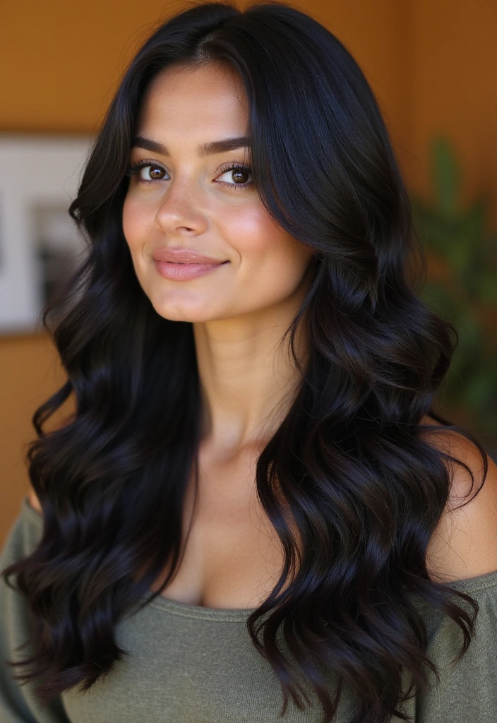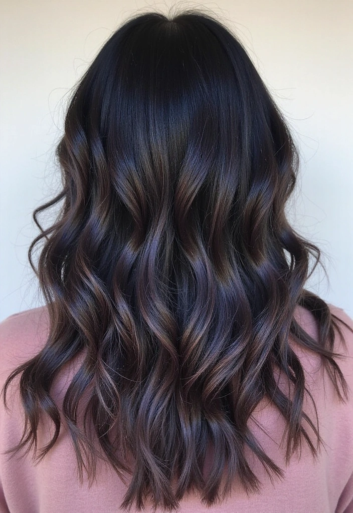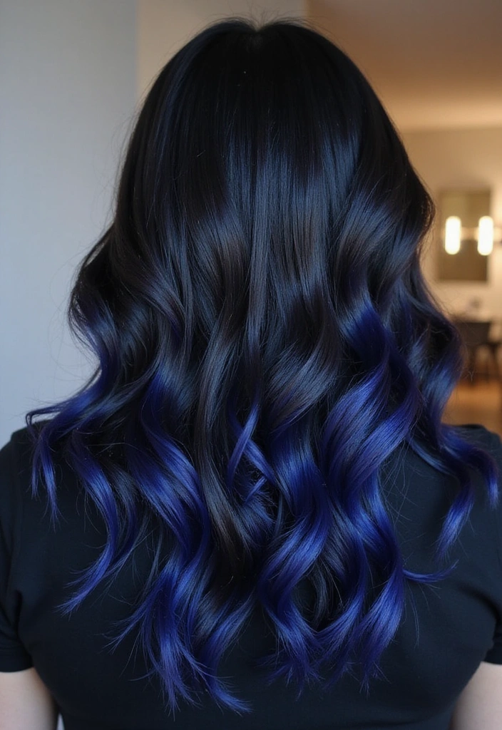 Indigo highlights on black hair create a deep and mysterious look that’s perfect for those wanting something unique. The cool tones of indigo add an edgy touch while still maintaining elegance. This color pops beautifully against the black base, especially in bright light!