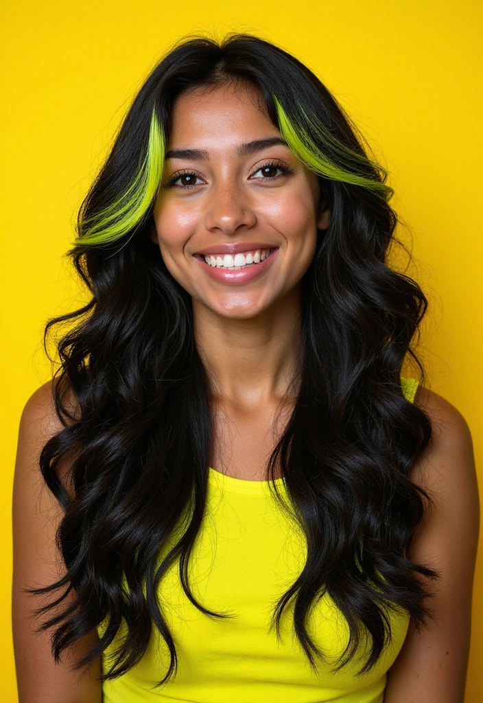 If you’re sporting a bold personality, then neon green highlights are the perfect choice! This bright, striking color demands attention and is perfect for those who want to express their fun side. Neon green stands out beautifully against black hair, creating an edgy look that’s perfect for festivals or parties.