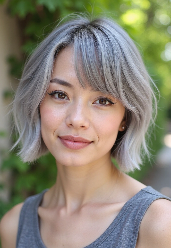 This bob is perfect for showcasing your gray hair while being low-maintenance and easy to achieve. It adds a youthful touch to your look, making it suitable for any occasion. Regular trims help keep the flicks looking fresh and lively, ensuring your hairstyle always has that playful edge.