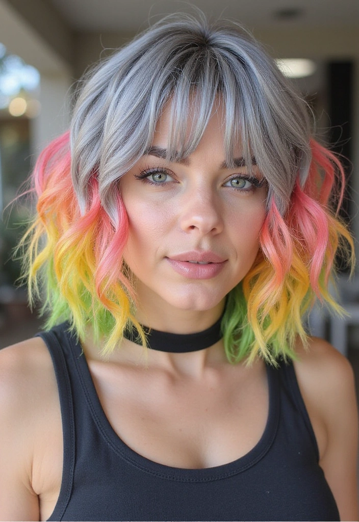 A colorful bob is an adventurous hairstyle that allows you to embrace your gray hair while adding a splash of color. This style features bright shades mixed with gray, creating a striking effect.