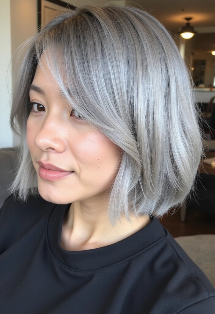 This style suits all face shapes and works beautifully with gray hair, highlighting its natural shine. To keep it looking fresh, regular trims every 6-8 weeks are recommended to maintain the shape. You can also use a light serum to tame flyaways and boost shine, giving your bob that extra glam factor.