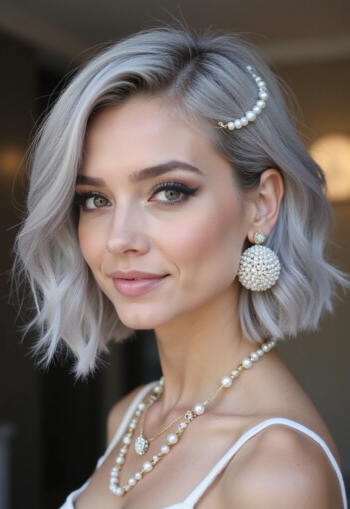 A pearled bob is a trendy hairstyle that adds a touch of elegance and sophistication. This style features pearl accessories or clips that enhance the beauty of your gray hair.