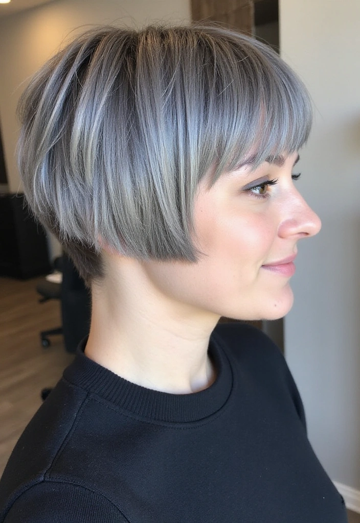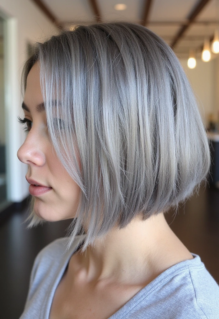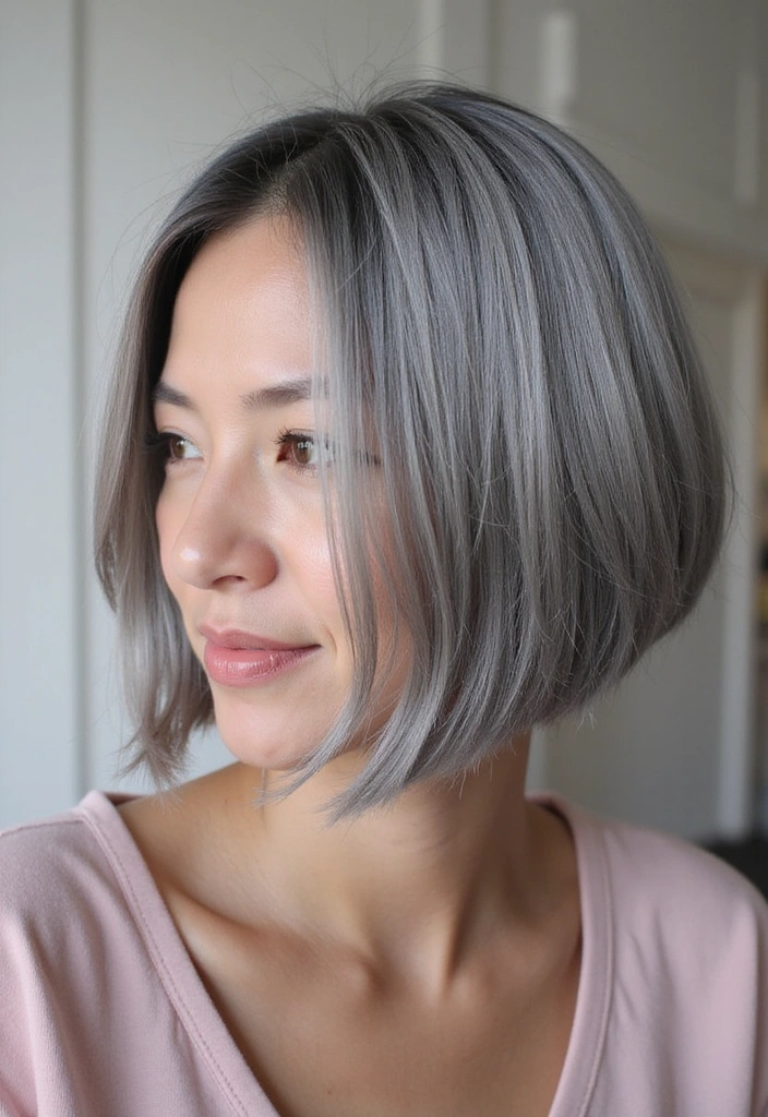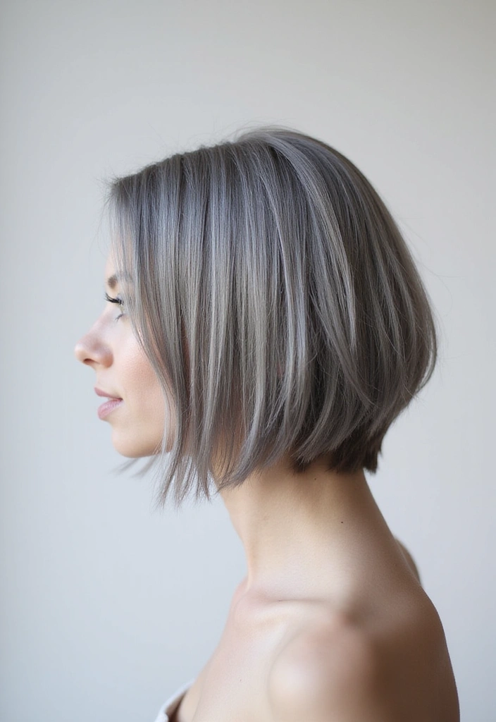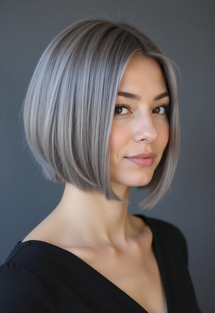 A smooth and sleek bob highlights the beauty of gray hair while providing a polished look. This style features straight strands that create a sophisticated appearance.