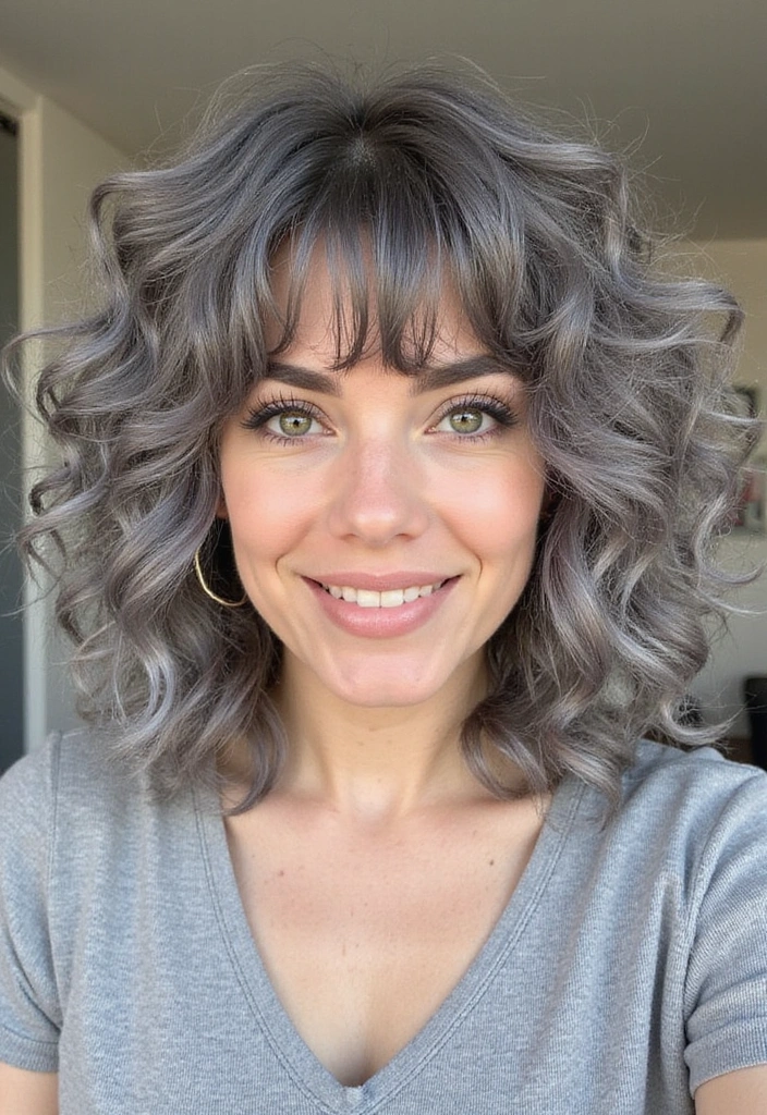 This hairstyle is perfect for showcasing your gray hair while adding a playful touch. It’s low-maintenance and can easily transition from day to night. Regular trims help keep those curls bouncy and bangs looking fresh and defined.