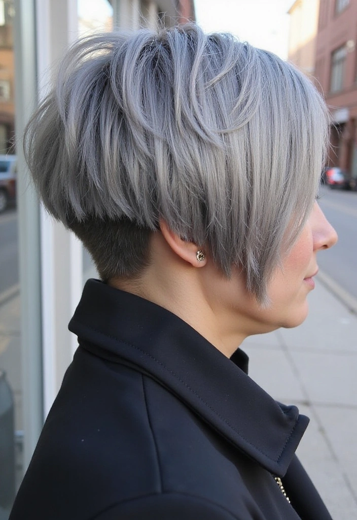 This style is perfect for those who want a hairstyle that sets them apart while being easy to maintain. It works beautifully with straight or slightly wavy textures, allowing gray hair to shine. Regular trims are necessary to maintain the shape and volume, ensuring you look your best every day.