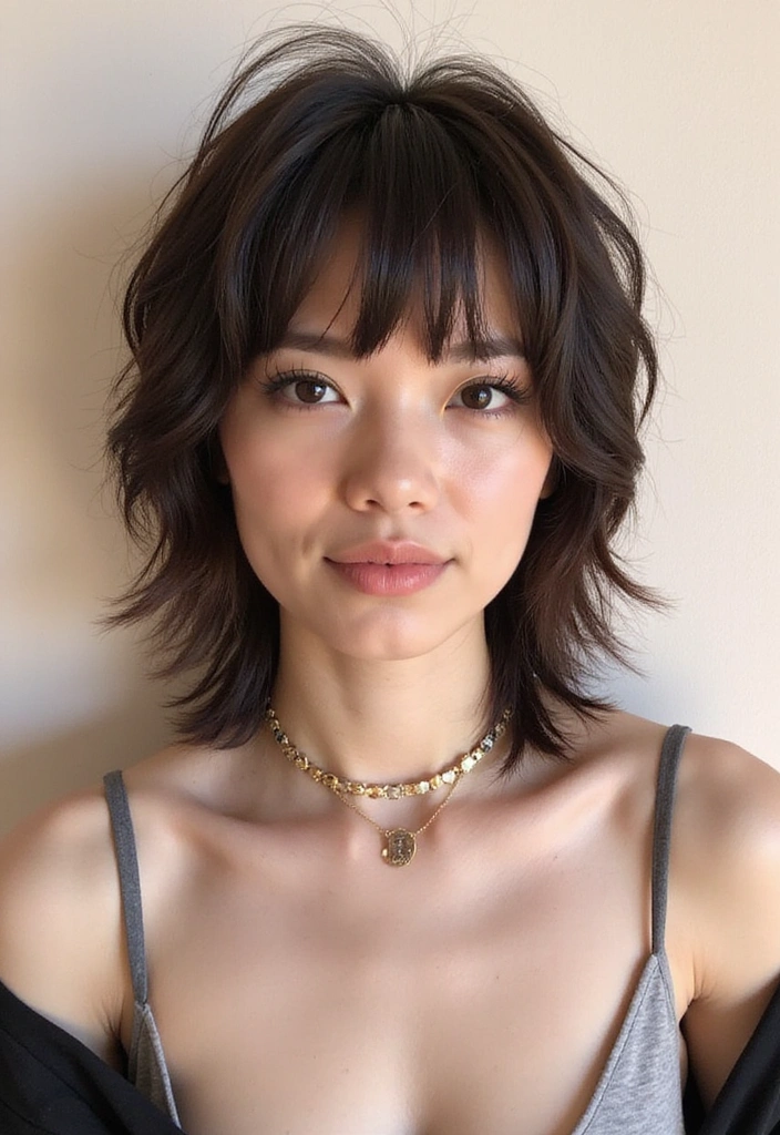 Textured bangs can add an intriguing flair to a shaggy mullet! This style brings a fresh and fun element, framing the face beautifully.