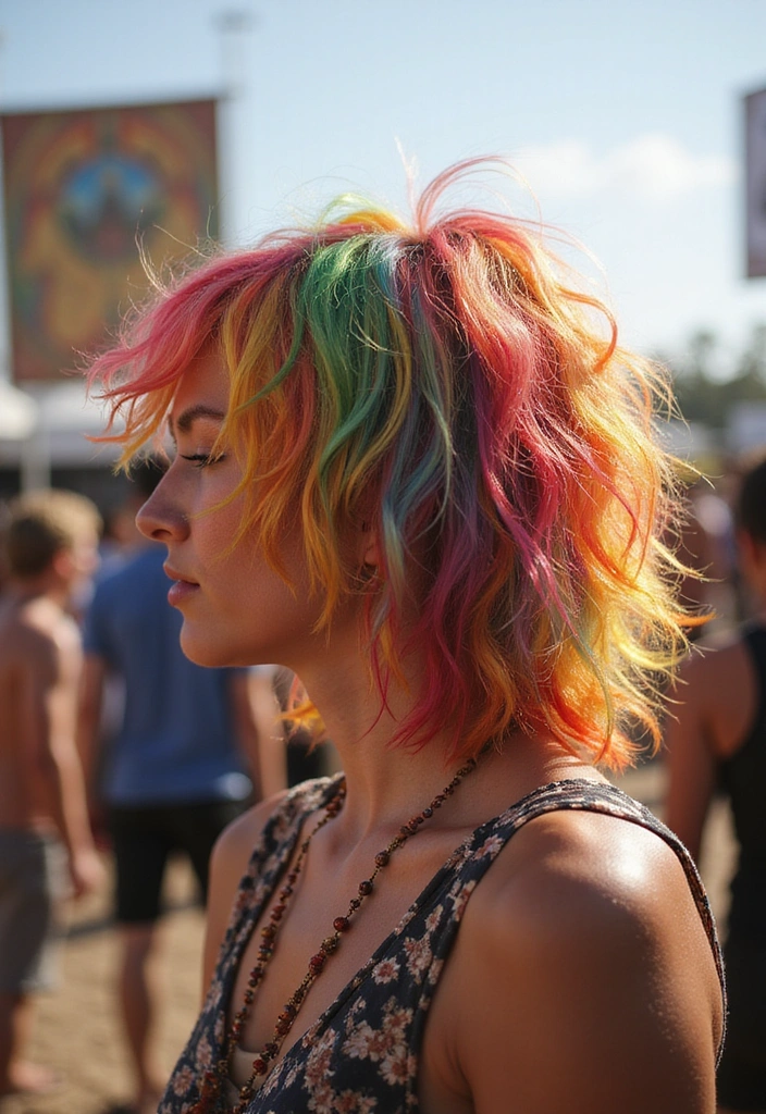 This style typically features bright, bold colors in a layered cut, creating a playful and youthful appearance. To maintain the vibrancy, consider using sulfate-free shampoos and conditioners. Each color can be styled in waves or curls to add even more flair. For a unique touch, experiment with accessories like colorful clips or pins. This hairstyle is perfect for music festivals or any event where you want to stand out and shine!