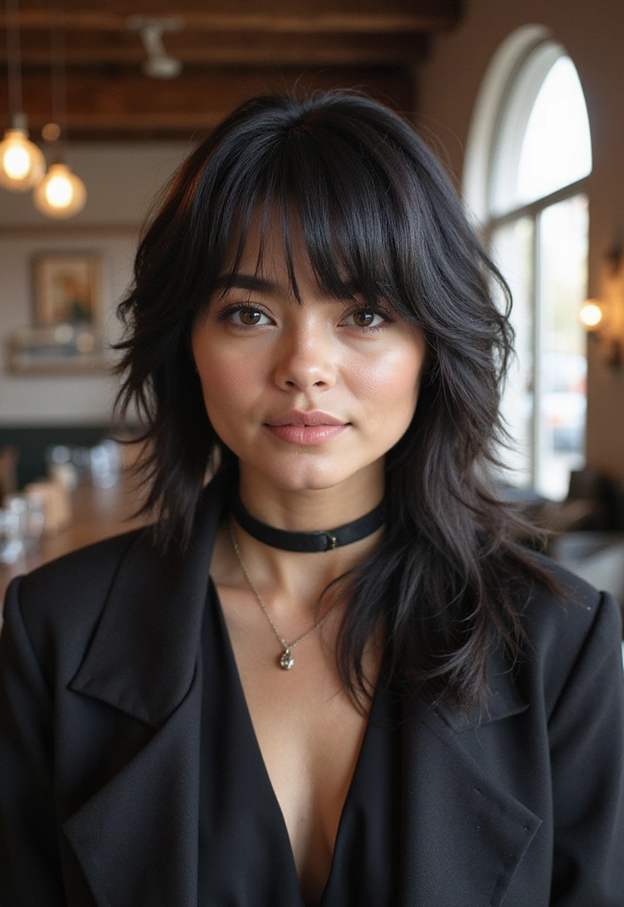 This style works well with various hair textures, whether straight, wavy, or curly. For a softer look, opt for curtain bangs that blend seamlessly into the layers. Products like smoothing serums can help keep the bangs in place and looking polished. This hairstyle is perfect for individuals wanting a soft yet edgy style that can transition from day to night effortlessly. Pair it with chic outfits for added flair!