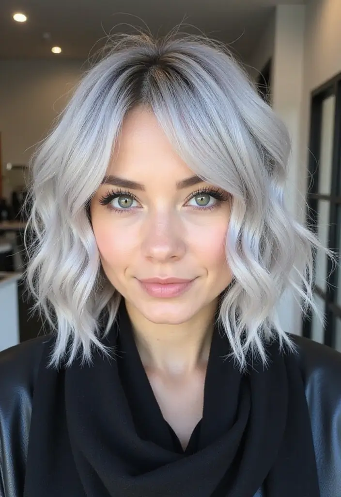Soft, flowing waves in silver are the epitome of elegance and femininity. This hairstyle is perfect for any occasion, whether it’s a casual brunch or an evening gala. The wavy texture adds volume and movement, making the silver color pop even more.