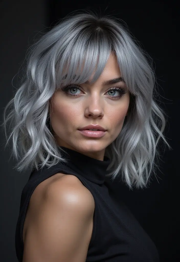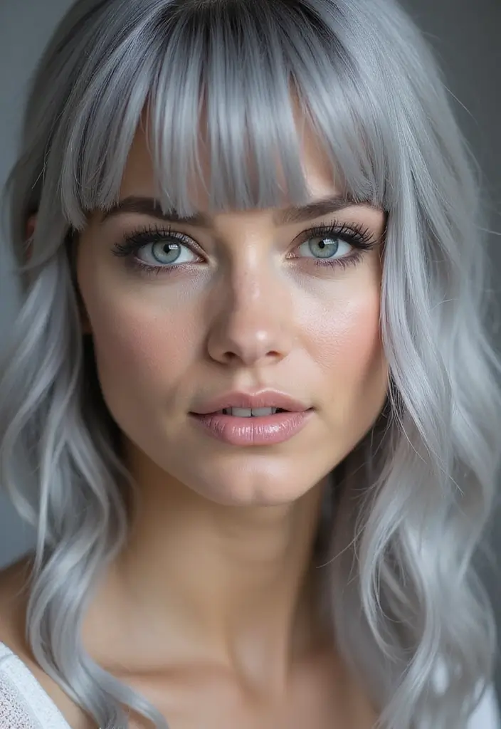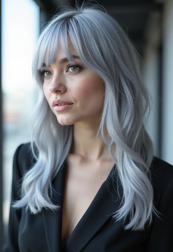 When styled with soft waves or straightened, curtain bangs with silver create a look that is both modern and timeless.