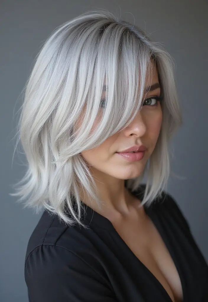 A choppy lob (long bob) is a trendy hairstyle characterized by its edgy and textured layers. When styled in silver, this look becomes even more striking. The choppy cut adds a playful flair, making it perfect for women who want a fun and modern look.
