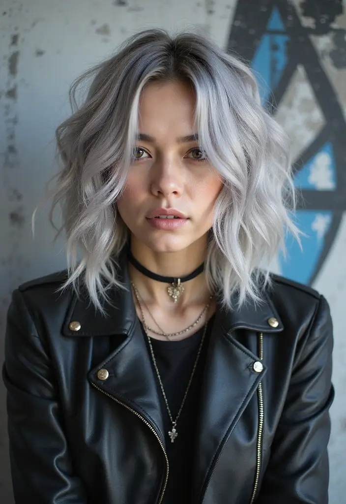 Rock a rocker chic look with silver hair styled in messy waves or a tousled bob. This hairstyle embodies a cool, edgy vibe that pairs perfectly with leather jackets and bold makeup. The silver color adds a modern twist to the traditional rocker style.